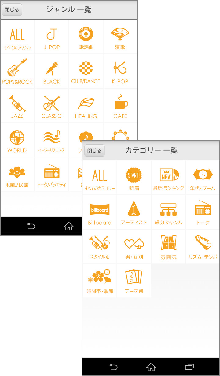 [ジャンル]は、J-POP、歌謡曲、演歌、POPS&ROCKS、BLACK、CLUB/DANCE、K-POP、JAZZ、CLASSIC、HEALING、CAFE、WORLD、イージーリスニング、アニメ、ファミリー/キッズ、和風/民謡、トーク/バラエティ、語学の18種類。