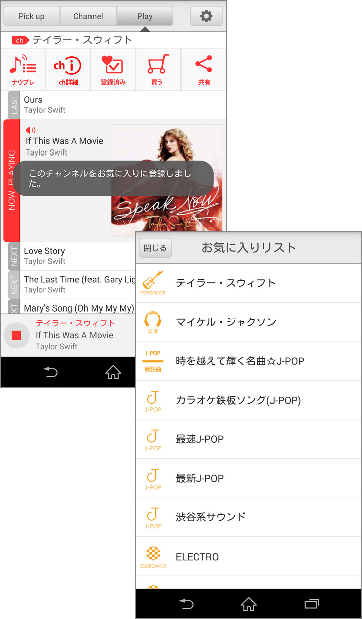 [お気に入り]に登録したチャンネルは、画面下部の再生曲の右側に表示されているお気に入りボタンをタップすると、リストが表示されます。この画面からいつでもお気に入りのチャンネルに切り替えることができるので、気になるチャンネルがあったら、お気に入りに追加しておきましょう。