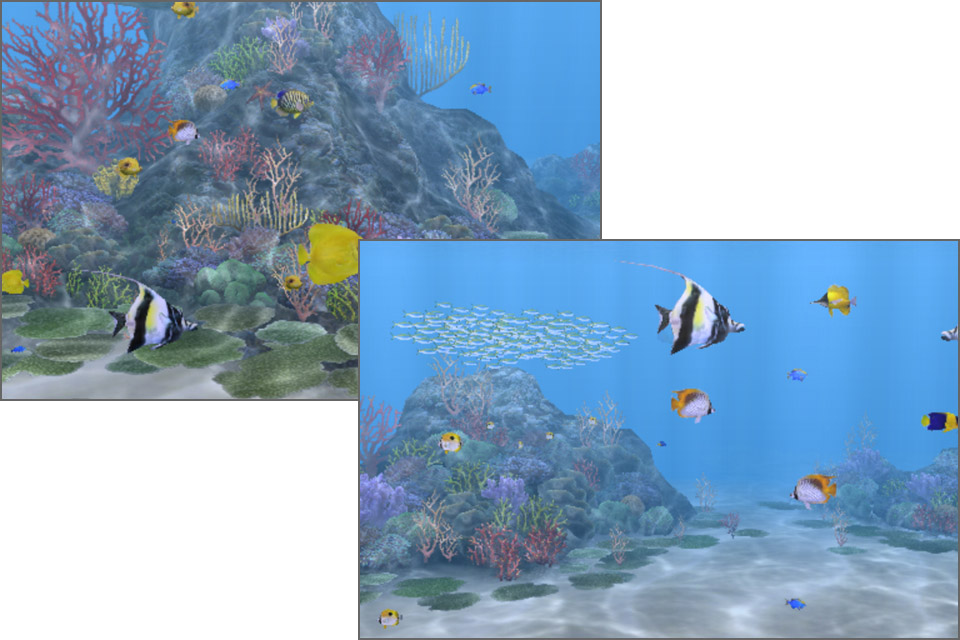 [config]画面で、[Event Timer]を30秒・60秒・180秒に設定した場合、その時間間隔で大型の海洋生物が出現します。それまで泳いでいた魚がすーっと消えていき、しばらく眺めているとウミガメ・イルカ・マンタ・サメ・クジラ等の、大きな海の生物がゆったりと泳いできます。