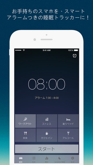 アラームをONにすると、[睡眠]画面でアラーム時刻を設定することができます。アラームを鳴らしたい時刻を設定しましょう。最後に、睡眠前の状況を[ワークアウト][ストレス][違うベッド][夜食][カフェイン][アルコール]から選んでタップしてください。外部要因が睡眠の質に与える影響を記録します。