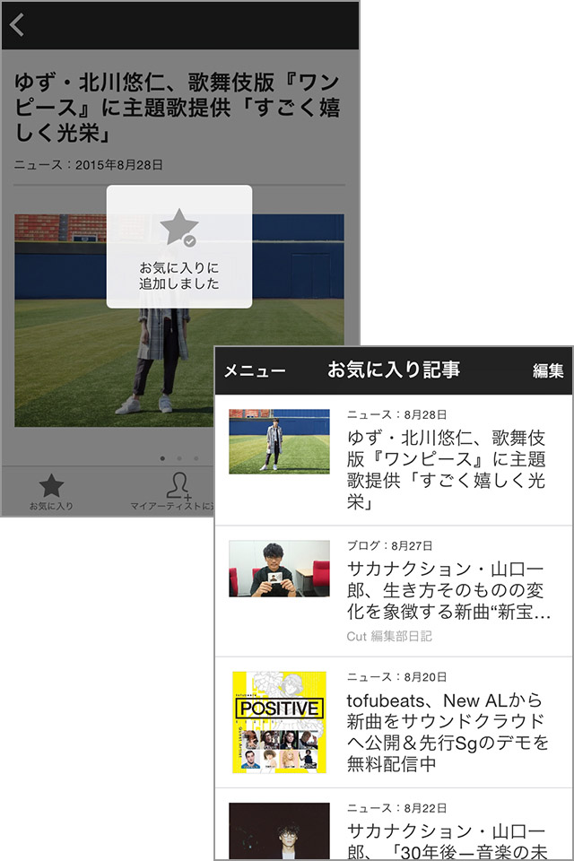 カテゴリの移動は画面を左右にスワイプします。カテゴリタブの下には[邦楽][洋楽]を切り替えられるボタンが用意されています。記事タイトルをタップすると、記事詳細が表示されます。気に入った記事は[☆お気に入り]ボタンをタップすると、『お気に入り』に追加して、いつでも読み返すことができます。