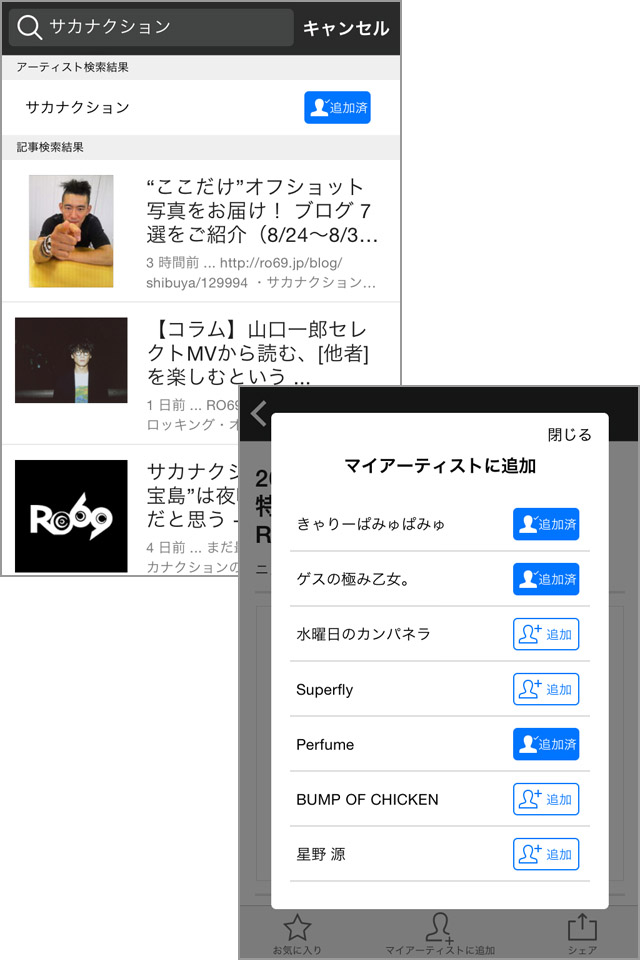 画面右上の検索ボタンでキーワード検索して、気になる情報を探すこともできます。アーティスト名を入力して検索すると、アーティスト検索結果と記事検索結果が表示されます。アーティスト名の右にある[追加]ボタンをタップすると、『マイアーティスト』に登録することができます。