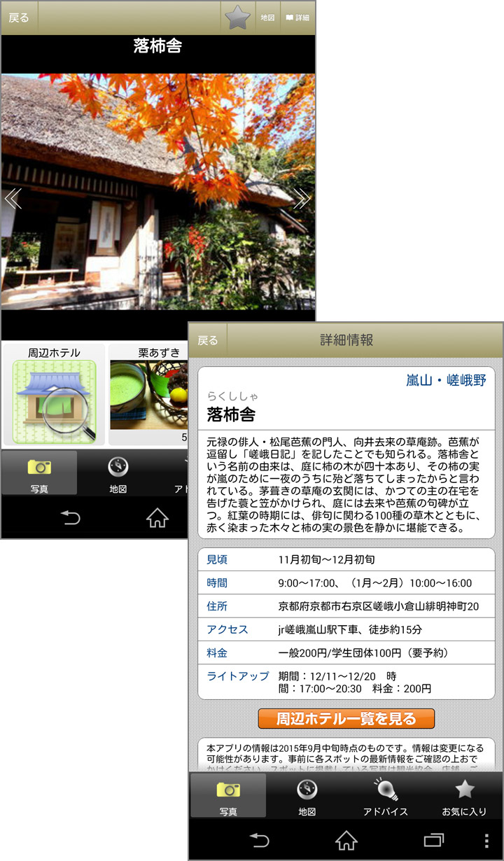 画面右上の[地図]をタップするとスポットの地図が表示されるので行動プランが立てやすくなります。また、[詳細]をタップすると、スポットに関する解説や、紅葉の見頃、拝観時間、住所、アクセス、料金などの詳細情報を見ることができます。気になるスポットが見つかったら、[☆]をタップして、お気に入りに追加しておきましょう。