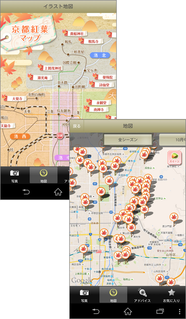 画面下部のメニュー[地図]をタップすると、[京都紅葉マップ]というオリジナルイラストの地図が表示されます。大まかなエリアをタップすると拡大表示され、紅葉スポットが地図上に表示されます。ピンで表示されたスポットをタップすると、スポット名が表示され、もう一度タップするとスポット情報画面に移動します。先ほどの写真画面と同様に画面上部のボタンで時期を指定して表示されることができます。