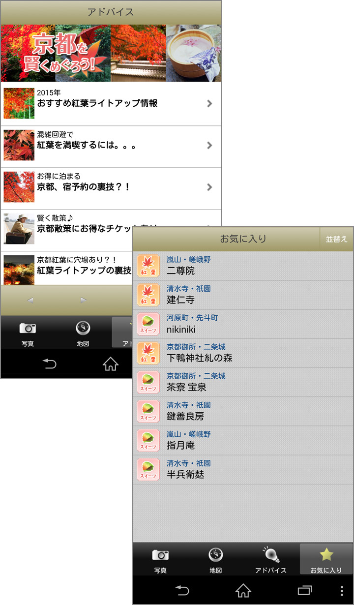 画面下部のメニュー[アドバイス]では、京都を賢く巡るためのアドバイスをコラム形式で見ることができます。紅葉ライトアップ情報や、混雑回避の裏ワザなど、秋の京都を散策するのに役立つ情報がたくさんあるのでチェックしてみてくださいね。