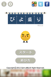 「ぴよ盛り」を起動して、[スタート]をタップするとゲームが始まります。「ぴよ盛り」の遊び方はとってもシンプル!ひよこを乗せたい場所をタップすると、ひよこが飛んできます。丼が乗っているテーブルをスワイプすると、くるくる回すことができます。丼を回して、バランス良くひよこを盛りましょう。黄色のひよこは、丼の上をつるっと滑る感じ。オレンジのひよこは、黄色のひよこにぴたっとくっつきます(オレンジどうしはくっつきません)。ひよこを10匹、丼から落としてしまうとゲームオーバーです。