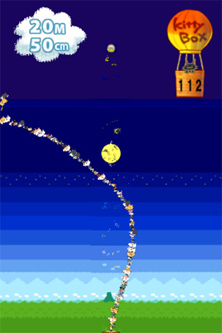まずは1人で遊んでみましょう!「つみネコ」を起動したら[1P]をタップ。『Kitty Box』と書かれた気球に入っているネコをタッチしてドラッグしながら、画面下の切り株の上に乗せましょう。次にまた気球からネコをドラッグして、先ほど置いたネコの背中に乗せます。同じ動作を繰り返して、ネコを縦1列に高く積み上げていきましょう。小さいコネコからデブネコまで、大・中・小の3サイズ。いろんな模様のネコがいて、積み上げるたびににゃーにゃーと鳴き声が。とにかくとってもかわいいです。[OPTION]で気球の位置を、左に変更することもできます。やりやすい位置に設定してね。
