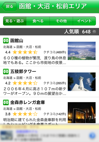 「じゃらん観光ガイド」を起動すると、[エリアから探す][現在地から探す][キーワード検索][お気に入り]のメニューと、[今、開催中のイベント]が表示されます。例えば「この夏は北海道に行きたいな」という場合は、[エリアから探す]をタップし、県の選択で[北海道]を選び、エリアを選択しましょう。[函館・大沼・松前]エリアを選択すると、函館山、五稜郭タワー、金森赤レンガ倉庫など、人気順にスポットが表示されました!写真やクチコミ評価が確認できるので、分かりやすいですね!上部メニューで[見る・遊ぶ][食べる][その他][イベント]を切り替えて絞り込むこともできます。