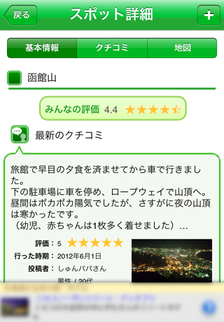 気になるスポットをタップすると、スポット詳細として[基本情報][クチコミ][地図]を確認できます。クチコミには、「夜は寒かった」「坂が急だった」「子ども連れならタクシーがおすすめ」「夜景は雨上がりが一番キレイ」など、現地に行かないとわからないような情報がたくさん。お出かけの計画を立てるときに、役立ちます!