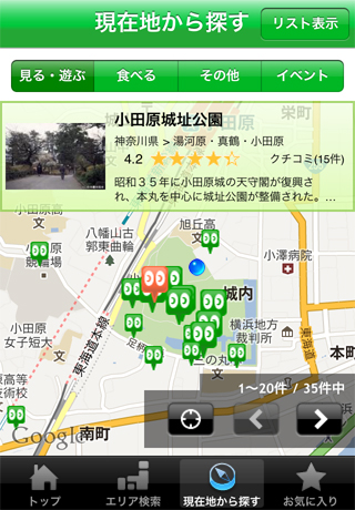 お出かけ当日に役立つのは、[現在地から探す]機能。「このあたりで他に面白そうなスポットは無いかな?」と思ったら、[現地から探す]をタップ!今いる場所の近くのスポットを表示してくれます。[見る・遊ぶ][食べる][その他][イベント]での表示はもちろん、地図の中心から[近い順で検索][人気順で検索]までできちゃいますよ。このように、「じゃらん観光ガイド」は、事前にお出かけの計画を立てるときも、現地に行ってからも使えるお役立ちアプリ!この夏のお出かけに、ぜひお役立てくださいね。