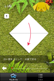 [サムネイル]か[リスト]から、折りたい動物を探してタップすると、折り方ガイドに進みます。左にスクロールさせながら、1から順番に折り方を見ていきましょう。実際の折り紙画像とテキストで説明があるので、とてもわかりやすいですね。さっそく[いぬ]を折ってみたところ、全11工程でかんたんに折ることができました!