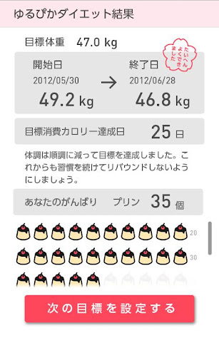 毎日朝と晩の体重を測って入力していきましょう。体重を入力するたびに、体重変化や生理周期に合わせて、『最新の晩体重は目標ゾーン内。この調子です!』などの、アドバイスメッセージが表示されるので、とても励みになりますね。オムロンの活動量計と併用すると、カロリー消費をがんばった日に、かわいいプリンマークをもらえる楽しい「ごほうびプリン機能」も楽しめます。まずは30日間、目標に向かって楽しくダイエットしましょう♪