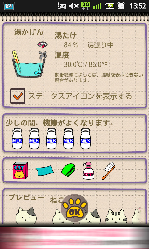 表示されている「風呂ねこ」ウィジェットをタップすると、設定画面が表示されます。設定画面では、湯かげんの確認と「風呂ねこ」の着せ替えができます。着せ替えは、ねこ、風呂、背景を右側のパーツリストから選択し、左側のプレビュー画面で確認します。好みの「風呂ねこ」が出来たらOKボタンをクリックする事で、ウィジットに反映されます。