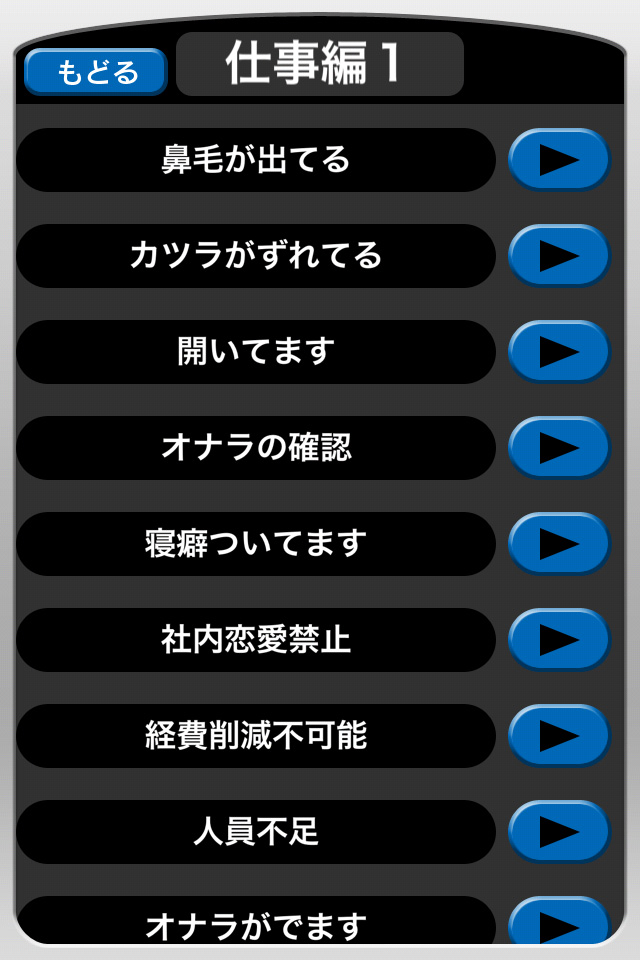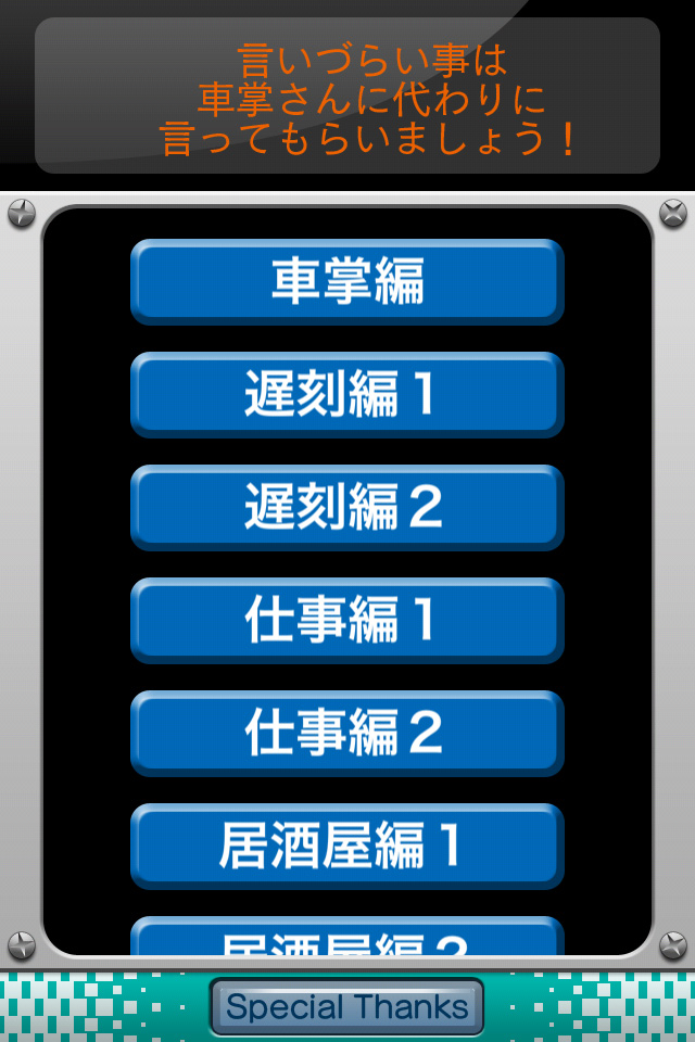 カテゴリは、[車掌編][遅刻編] [仕事編] [居酒屋編][別れ話編][名言編][Love]など、全部で26カテゴリ。例えば[仕事編1]を選んで、[再生]をタップしてみると、「ェ、ハナゲガデテイマァス(鼻毛が出ています)」、「ェ、コレカラオナラハッシャイタシマァス(オナラがでます)」のように、いろんなシチュエーションのセリフを車掌風に発音してくれます。