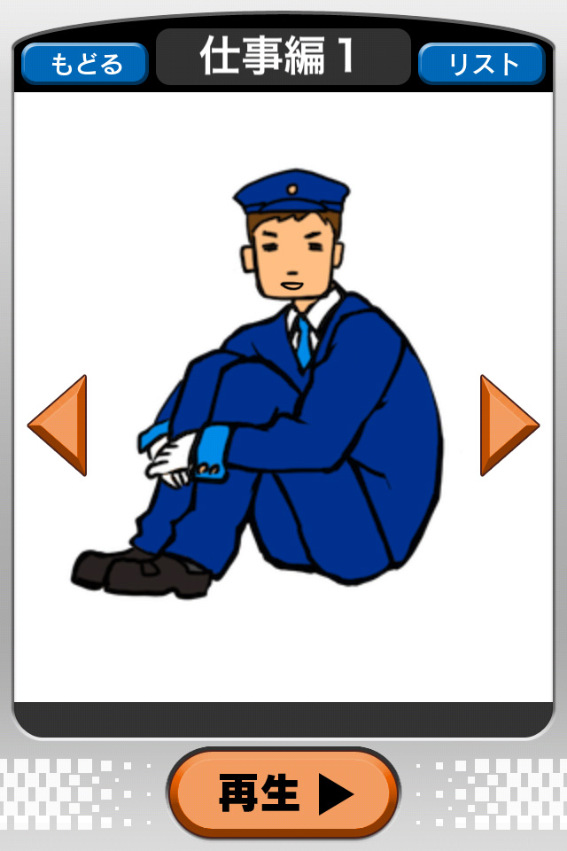 『ダァシェリエス!』…電車の車掌さんの「ドア、閉まります」の声が、こう聞こえたことはありませんか?今回ご紹介する「ダァシェリエス」は、月刊誌『Mac Fan』の「快発会社pAple」から生まれた電車の車掌ボイスアプリ。車掌さん独特の発音で、駅や電車内でお馴染みの『車掌セリフ』はもちろん、日常の言いづらいセリフを代弁してくれるおもしろアプリです。アプリを起動すると、[車掌編]の画面が表示されます。[再生]をタップしてみると、アプリ名にもなっている『ダァシェリエス!』の声が。左上の[戻る]をタップすると、カテゴリ別の一覧が表示されます。