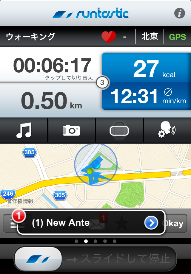 リアルタイムで表示されるデータを見ながら、ウォーキング開始!基本データ画面(時間、距離、スピード、消費カロリー、地図)が表示されます。画面をスライドすると、地図画面、走行ペース・高度画面、コンパス画面を切り替えてチェックできます。顔アイコンをタップすると、トレーニング中にリアルタイムで声援を送ってもらうことも!