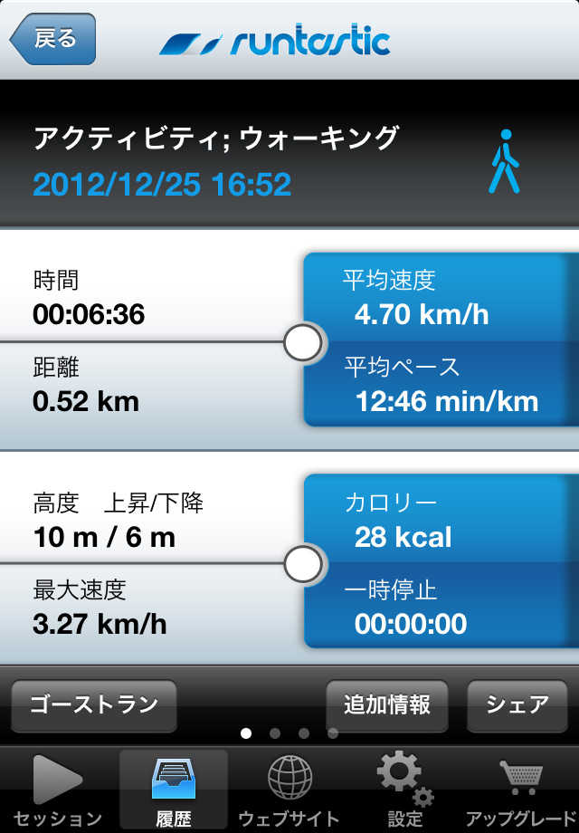 ワークアウトが終了したら、保存するか破棄するかを選択します。データを保存する場合は、フィーリング・路面・気温・メモ・心拍数などを入力することができ、そのデータが runtasticにアップされます。画面下部の[履歴]メニューでは、これまでに記録したデータを確認できます。それぞれのワークアウトのデータや全体のデータも詳しく見ることができるので、モチベーションも上がりますね!