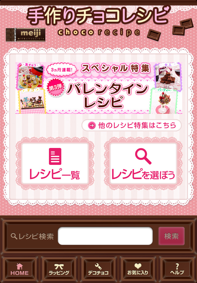 来週はバレンタインですね。チョコを手作りするなら「明治手作りチョコレシピ」は必見のアプリ。明治ミルクチョコレートを使った手作りチョコレシピが満載♪レシピだけでなく、ラッピングのアドバイスやデコチョコのシミュレーションなどお役立ち機能も!