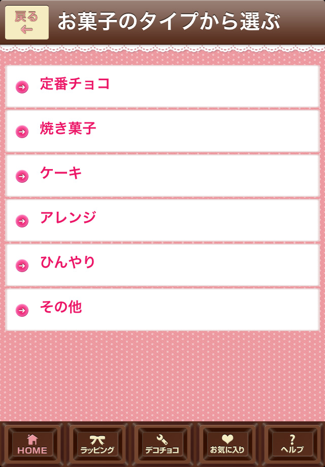 「明治手作りチョコレシピ」を起動して、レシピを選びましょう。[レシピ一覧]ではジャンルを問わず一覧を表示、[レシピを選ぼう]では難易度やお菓子のタイプ、条件から検索、[レシピ検索]ではフリーワード検索ができます。[レシピを選ぼう]→[お菓子のタイプから選ぶ]をタップすると、[定番チョコ][焼き菓子][ケーキ]など、お菓子のタイプからレシピを選べます。