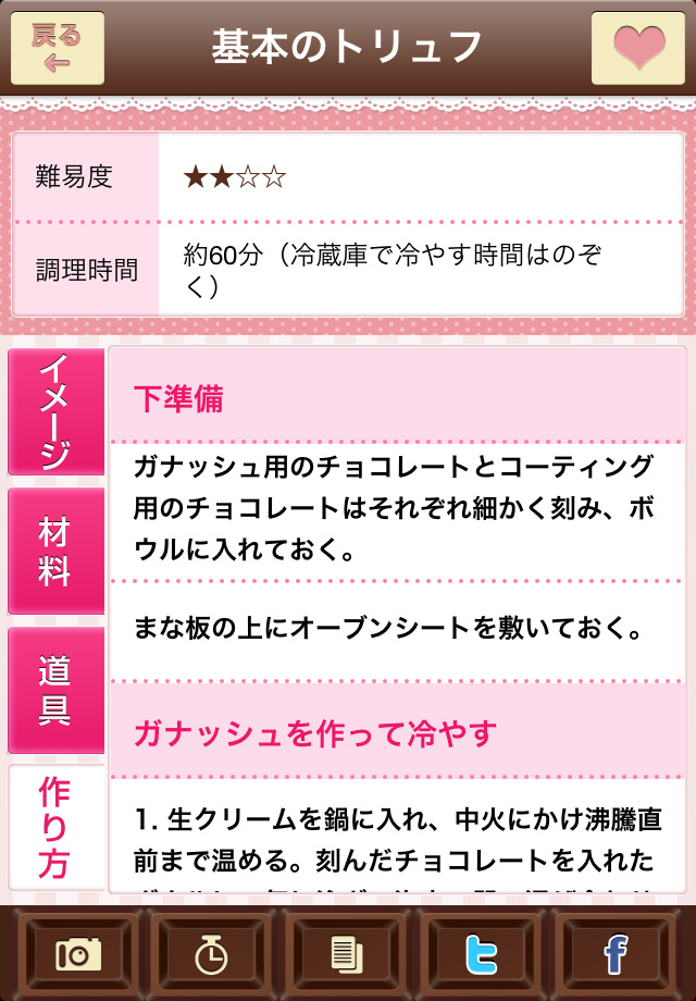 材料・作り方・道具が詳しく書かれた初心者にも優しいレシピ画面。気に入ったレシピは画面右上のハートマークをタップして、[お気に入り]に保存しましょう。画面下部のメニューから、写真を登録したり、メモを書いたり、SNSにレシピを投稿することもできます。キッチンタイマーや、ラッピングのアドバイス、デコチョコのシミュレーションなどお役立ち機能も満載!このアプリがあれば来週のバレンタインもバッチリですね♪