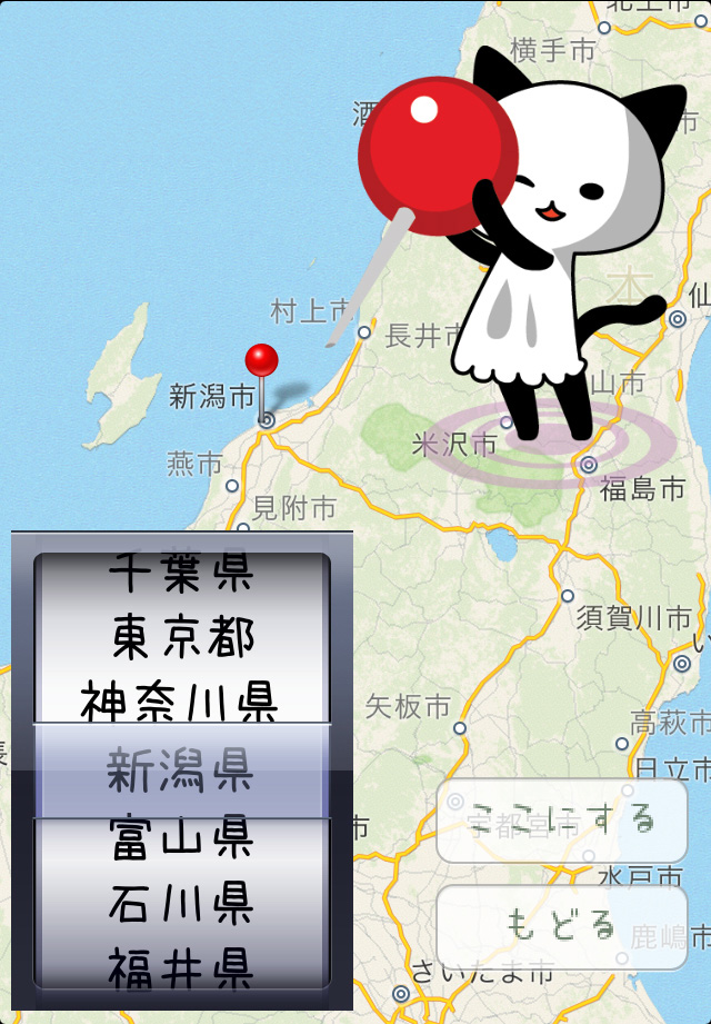 「ねこカン」を起動すると、初回起動時に[”ねこカン”は現在の位置情報を利用します。よろしいですか?]と表示されるので、[OK]をタップ。自動的にGPSデータを読み込んで、いまいる場所の天気を表示します。かわいいお天気ねこ『ねこてる』が、「あしたは晴のち曇。今日よりちょっとさむいみたい。」と、シンプルに教えてくれるんです!画面をタップすると、[最高気温][最低気温]もちゃんと表示されますよ。