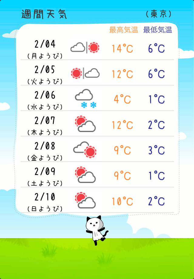 天気予報の画面を横にフリックすると、「明日の天気」「週末の天気」「週間天気」を順番に見ることができます。一週間の天気予報も確認できて、とっても便利。「ねこカン」は、とにかく分かりやすくてシンプル、さらにかわいくて癒される、一押しのお天気アプリです!