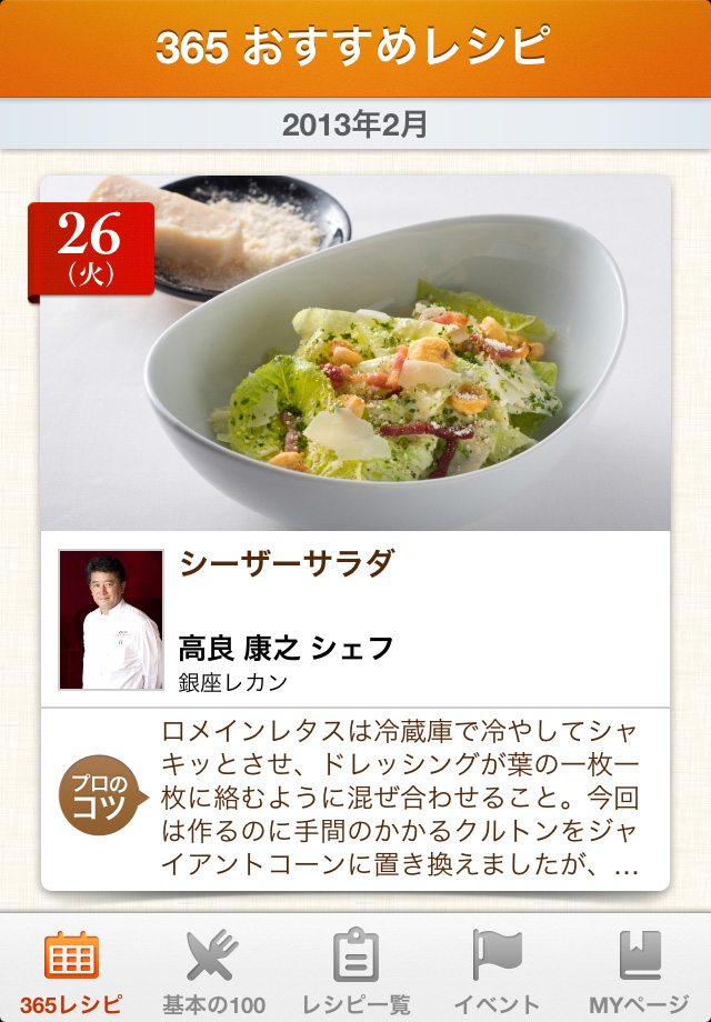 「シェフごはん - プロから学ぶ簡単家庭料理」を起動すると、[365レシピ]の画面が表示されます。数あるシェフのレシピの中から、季節や時期に応じたレシピを毎日ピックアップして紹介してくれる便利なメニューです。プロのコツを毎日学んじゃおう♪