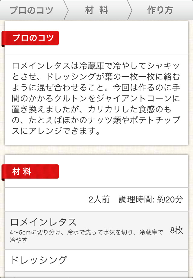 料理の画面をタップすると、[プロのコツ][材料][作り方]のレシピ画面が表示されます。いままで知らなかったプロのコツや、材料、調理時間、作り方が丁寧に書かれたレシピです。レシピをメール・Twitter・Facebookで共有して、お友達やご家族に教えてあげるのもいいですね!