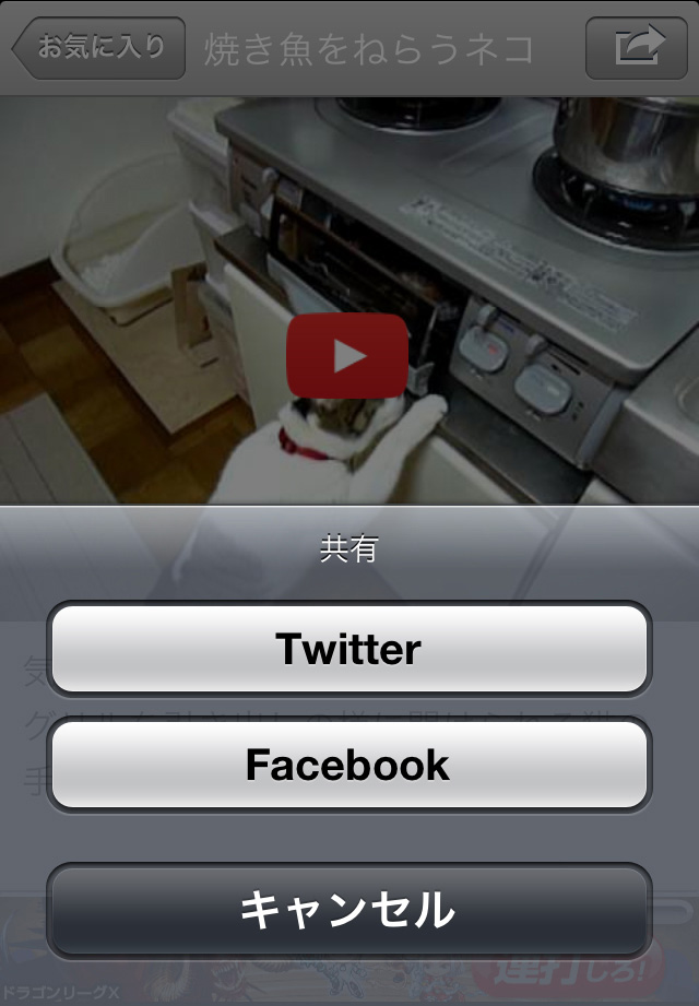 動画詳細画面のサムネイルに表示されている再生マークをタップすると、動画が再生されます。『よちよち子猫』の動画を観てみましたが……かわいい!かわいいです!!癒されますね~。気に入った動画には、コメントをつけたり、[お気に入り]に追加して自分だけの動画リストを作ることができます。[お気に入り]への追加方法は、動画詳細画面の右上の[+]マークをタップするだけ。トップ画面の[お気に入り]からいつでも観ることができます。[お気に入り]に追加した動画は、TwitterやFacebookで共有することもできます。お気に入り動画の詳細画面右上のアイコンをタップすると、共有メニューが表示されます。ログイン認証して、お友達にもかわいいねこ動画を紹介してあげましょう!ねこ好きにはたまらないアプリです。ぜひダウンロードしてみてくださいね♪