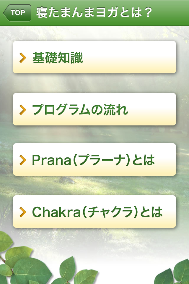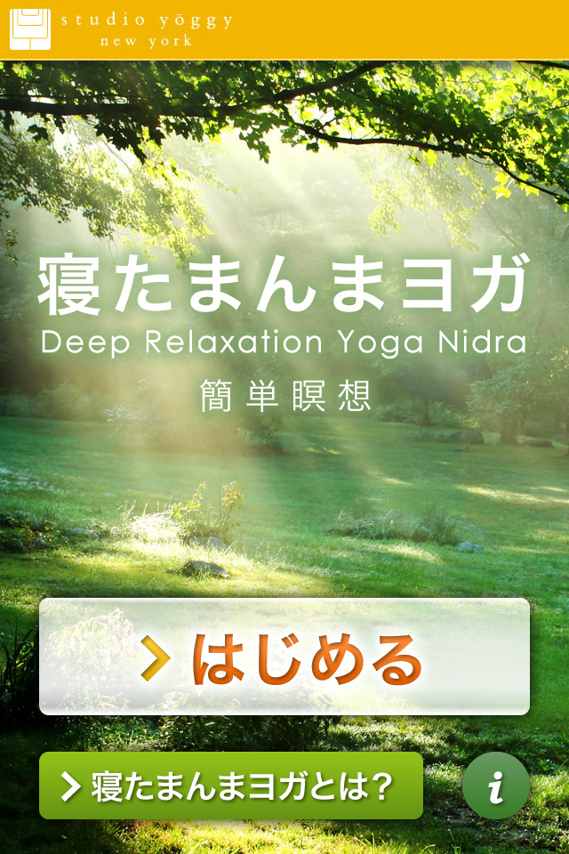 アプリを起動すると、[はじめる][寝たまんまヨガとは?]のメニューと(i)マークのインフォメーションメニューがあります。このアプリは寝たまんまヨガ(ヨガニードラ)を、音声に従って行うのですが、『仰向けのシャヴァアサナで…』『それではサンカルパを…』などのヨガの言葉が出てくることがあるので、まずは[寝たまんまヨガとは?]をタップし、[基礎知識][プログラムの流れ][Prana(プラーナ)とは][Chakra(チャクラ)とは]を一通り読んでおきましょう。説明は図解入りでとてもわかりやすく、安心です。