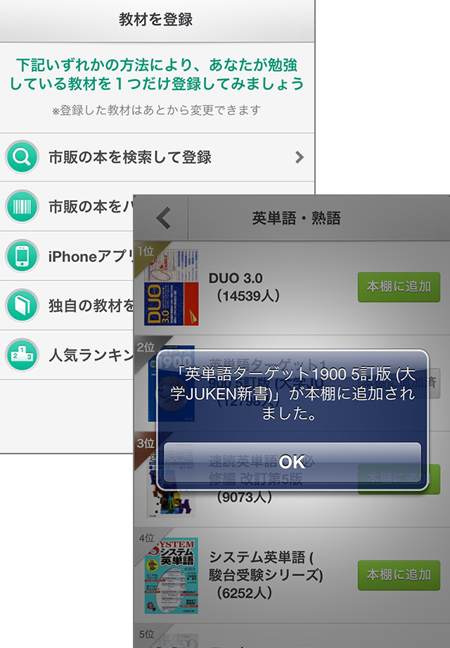 今回は、iPhone版の画面で解説しますね。アプリを起動したら、まずは会員登録から。アカウント名・メールアドレス・パスワードを入力して、[新規会員登録]をタップして登録完了。(後ほど、登録したアドレスに届くメールのURLをクリックして、メールアドレスの登録を完了させるのを忘れずに!) 登録後、チュートリアルが表示されるのでよく読んでおきましょう。次に、教材の登録です。勉強に使う教材を、[市販の本を検索して登録][市販の本をバーコードから登録][iPhoneアプリを検索して登録][独自の教材を登録][人気ランキングから登録]の中から選んで登録します。登録した教材は[本棚]からいつでも確認・管理ができ、科目別などカテゴリの設定もできます。教材を登録したら、さっそく勉強を開始しましょう!画面左上のメニューボタンをタップして、[本棚]から、今日の勉強に使う教材を選んで[記録する]をタップ。こちらの画面で学習時間やページ数を記録することもできますが、便利なのは[ストップウォッチ]の機能!画面上部にある時計アイコンをタップすると、ストップウォッチの画面が表示されます。[開始]をタップすると、学習時間をカウントしてくれます。勉強が終わったら[停止]をタップ。