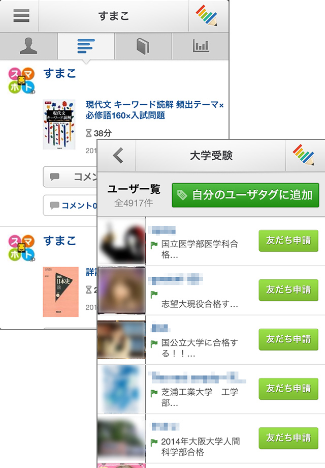 勉強のモチベーションを上げるさらなる方法として、SNS機能を活用しましょう![友達を探す]メニューの[フリーワード検索から探す]をタップ。目標・プロフィール・姓名・ニックネームなどからお友達を探して[友だち申請]をタップしましょう。申請が承認されると、 お互いの[友だちのタイムライン]に勉強ログが公開されます。「いいね」やコメントをつけ合ったり、お互いの勉強記録を見て切磋琢磨することができますよ。「Studyplus」を使っているお友達がいないときは、[ユーザータグ]や[コミュニティ]で、新たな勉強仲間を作りましょう。共通の目標を持って勉強している人と仲良くなって情報交換を行ったり、励ましあってモチベーションを高めたり、一人で勉強するよりはかどること間違いなし♪