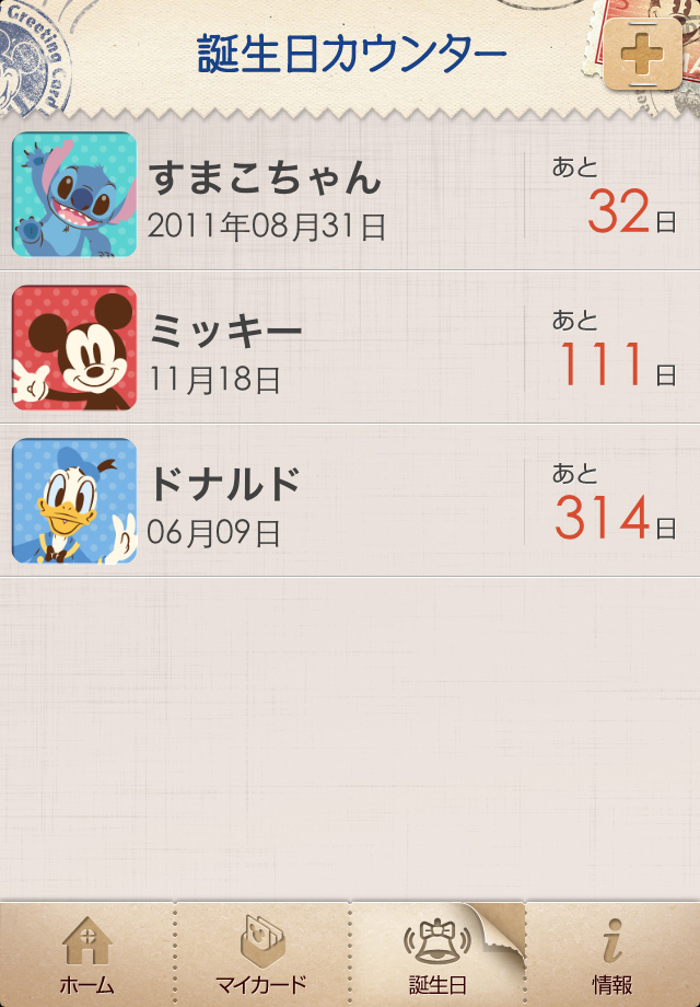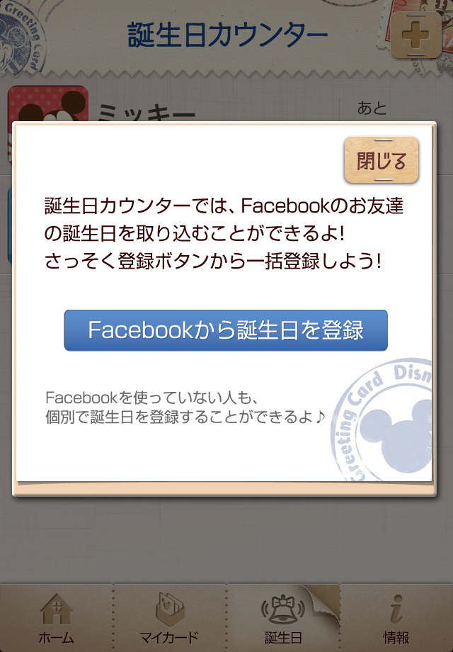 ディズニーグリーティングカードのもう一つの魅力は、お友達の誕生日を管理してくれる便利な機能がついていること。画面下部のメニュー[誕生日]をタップすると、[誕生日カウンター]が表示されます。画面右上の[+]ボタンをタップして、お友達の名前と誕生日を登録しておくと、誕生日当日までをカウントダウンでお知らせしてくれます。個別登録の他、Facebookのお友達の誕生日をまとめて取り込むことができて、とっても便利。これがあれば、誕生日をうっかり忘れちゃうということはありませんね。「ディズニーグリーティングカード」は、お祝いや日頃の感謝を伝えるのにぴったりなアプリです。ぜひ使ってみてくださいね!