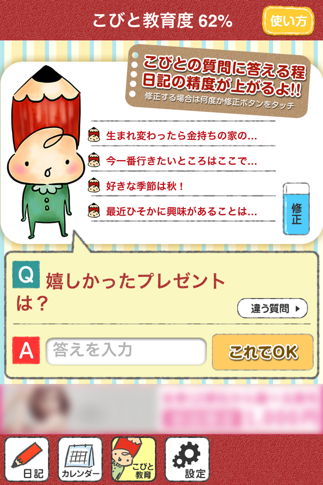 「こびと日記」は、こびとが自動で日記を書いてくれるアプリです。まずは設定をしましょう。画面下部の[設定]ボタンをタップすると、設定画面が表示されます。設定メニューは[音の設定][日記の内容を全部削除する][教育したこびとの記憶をすべて消す][こびとが日記を報告する時間]の4つ。 [こびとが日記を報告する時間]をタップして、[通知機能を使いますか?]をオンにしましょう。通知がONの場合に、設定した時間に日記を書いてお知らせしてくれます。通知を[オン]にしたら、時間を選択して、画面右上の[完了]をタップ。これで設定した時間にこびとが日記を書いてくれるようになります。ただし、こびとの日記、最初はこびとが勝手に書くので、あなたの日記としてはダメダメな可能性大。あなたの日記らしくなるように、こびとを教育しましょう!画面下部の[こびと教育]ボタンをタップ。[こびと教育]では、こびとがあなたに関することをいろいろ聞いてきます。『今一番行きたいところは?』『好きな季節は?』『好きなスポーツは?』『仲良しの人は?』『嬉しかったプレゼントは?』など、こびとの質問に答えましょう。『こびと教育度』がアップすると、日記の精度が上がって、あなたの日常生活に近い日記を書いてくれますよ♪