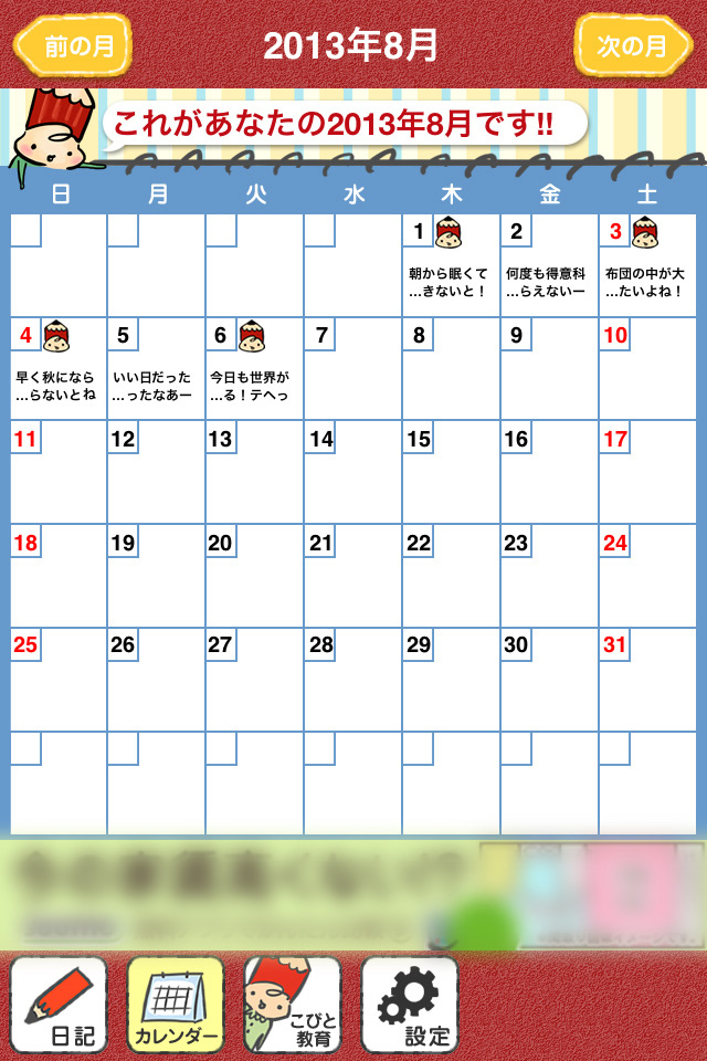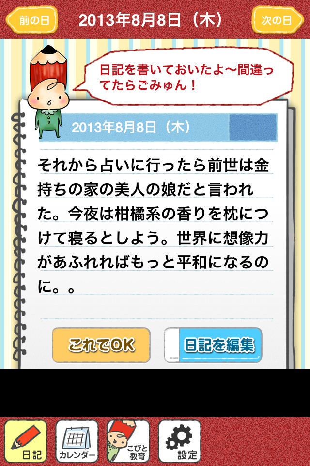 設定した時間になると、『日記を書いておいたよ~間違ってたらごみゅん!』と、こびとが日記を書いてお知らせしてくれます。さっそく日記を読んでみましょう。『こびと教育度』が低いうちは、あなたとあまり関係ない日記が書かれていることも。日記としてあまりにも違うなあと思ったり、書いておきたいような出来事があった日は、[日記を編集]をタップして、自分で日記を書きましょう。画面下部の[カレンダー]ボタンをタップすると、日記の一覧がカレンダー形式で確認できます。毎日こびとが日記を書いてくれるので、書き忘れもありません。うっかりさんやずぼらさんには特におすすめの日記アプリですよ!